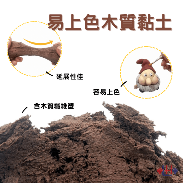 木塑土(英文為Wood Clay)由木質纖維素、水、黏劑、抗菌劑混合而成。木塑土本身具有淡淡的木頭香味,與木頭質感非常相似,材質略有粗糙感,柔順滑溜好捏塑,重量比超輕土重一些。此款黏土非常適合色彩的點綴(可使用壓克力顏料,能讓顏色較飽和),會讓作品呈現古樸的風格。